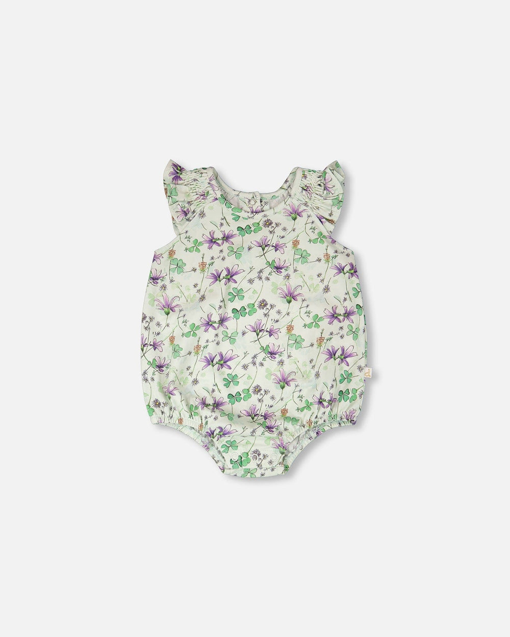 Delightfully sweet, this jersey romper green with printed flower brings charm and comfort to every sunny day. The romper features flutter sleeves, gathered detailing at the legs, bottom snap closure, a delicate allover floral print and a breathable blend of Tencel and rayon that feels soft against delicate skin. A lovely piece for little girls, it pairs beautifully with other items from our "Clovers And Violets" collection.