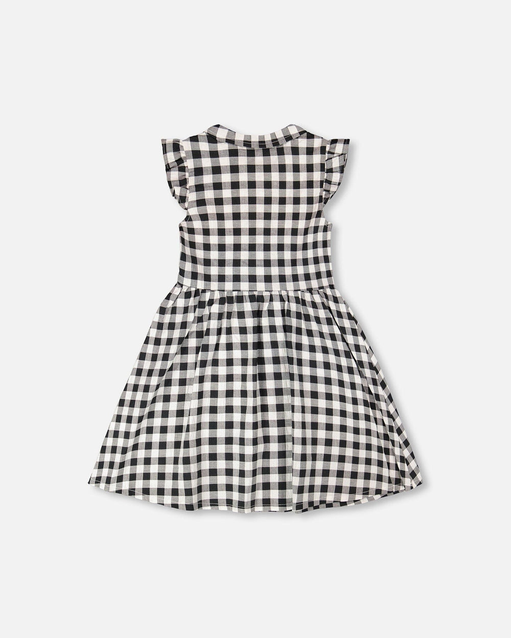The sleeveless button down dress in black gingham is a playful twist on a timeless classic. Featuring a peter pan collar, front button placket, and ruffled armholes, this dress combines charm with ease. Its gathered skirt makes it perfect for twirling, while the gingham pattern adds a fresh summer feel.