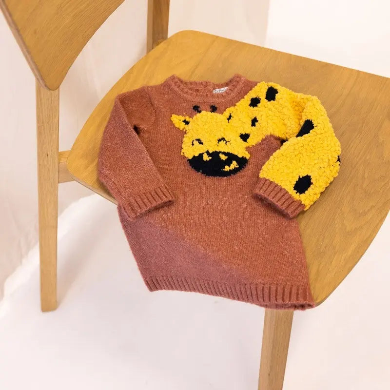 The Dirkje girls dress in old pink has a beautiful knitted giraffe head on the front and a sleeve in yellow with giraffe spots. The knitted dress has a straight fit and closes with buttons in the neck for sizes up to 86.