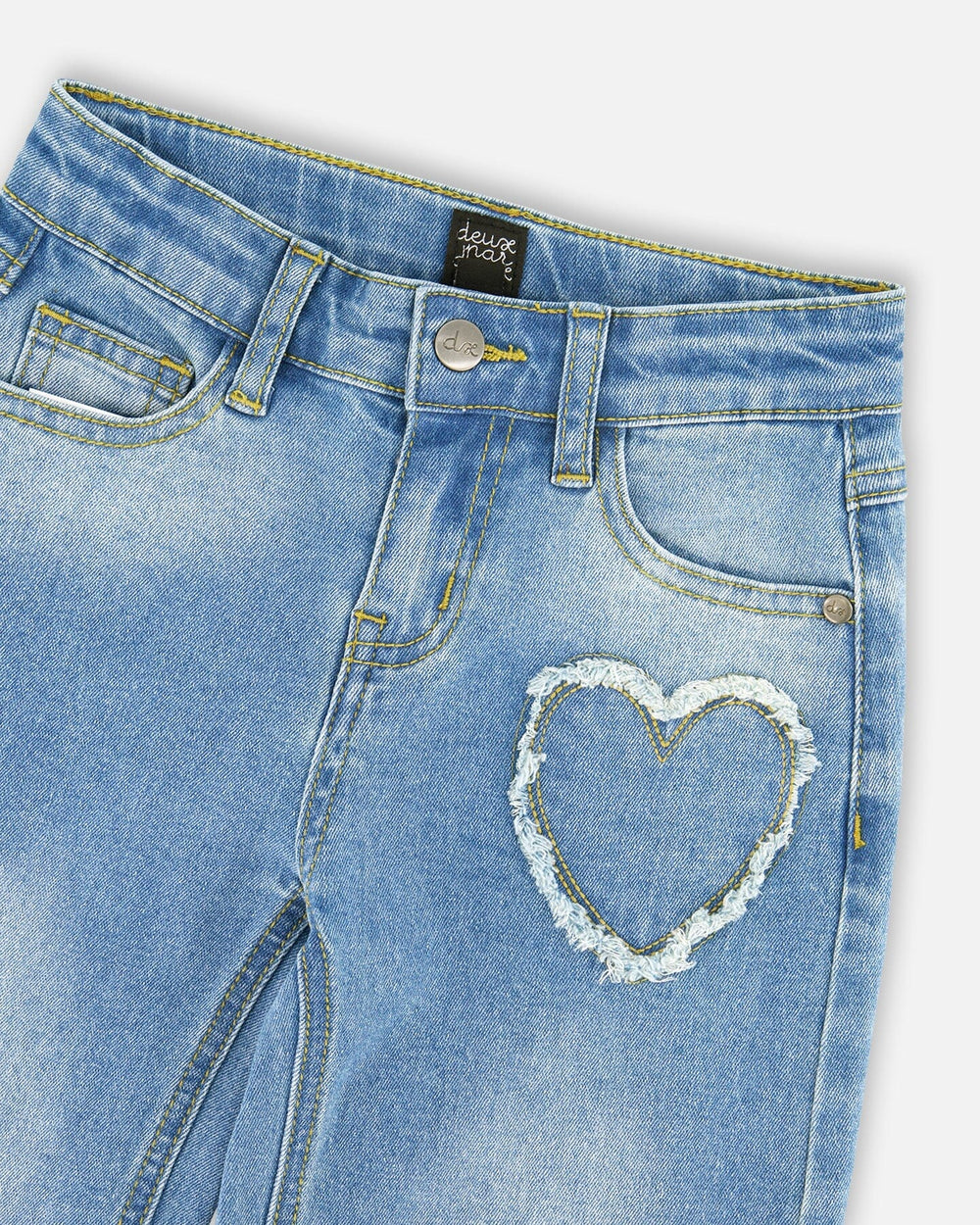 The wide leg jeans in light blue denim bring a playful twist to a timeless favorite. This pair features real front and back pockets, heart-shaped embroidery, belt loops, and a button closure for an authentic denim feel. Made from soft stretch cotton denim, they combine comfort, durability, and a dash of sweetness for every girl’s adventures.