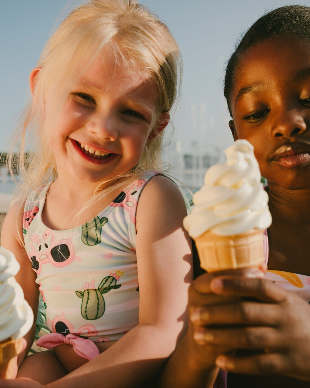 This two-piece swimsuit in blue with flamingo and cactus print brings playful charm to summer days. This set features a sporty crop top adorned with a bow at the hem and paired with matching bikini bottoms featuring bow ties at the sides. Crafted in recycled stretch fabric, it ensures comfort and ease for all-day fun at the beach or pool.