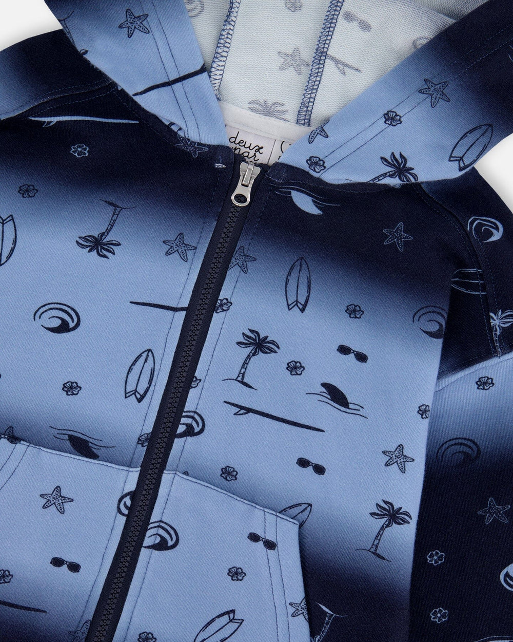 The hooded French terry cardigan blue gradient is the perfect mix of comfort and style for adventurous boys. This long-sleeve layer comes with a full zip closure, an attached hood, front pouch pockets, ribbed cuffs, and a ribbed hem for a snug finish. A fun seaside-inspired print on the chest adds a playful accent, while the soft cotton-elastane French terry fabric ensures ease of movement and all-day comfort, ideal to pair with any bottom from the “Coastal Days” collection.